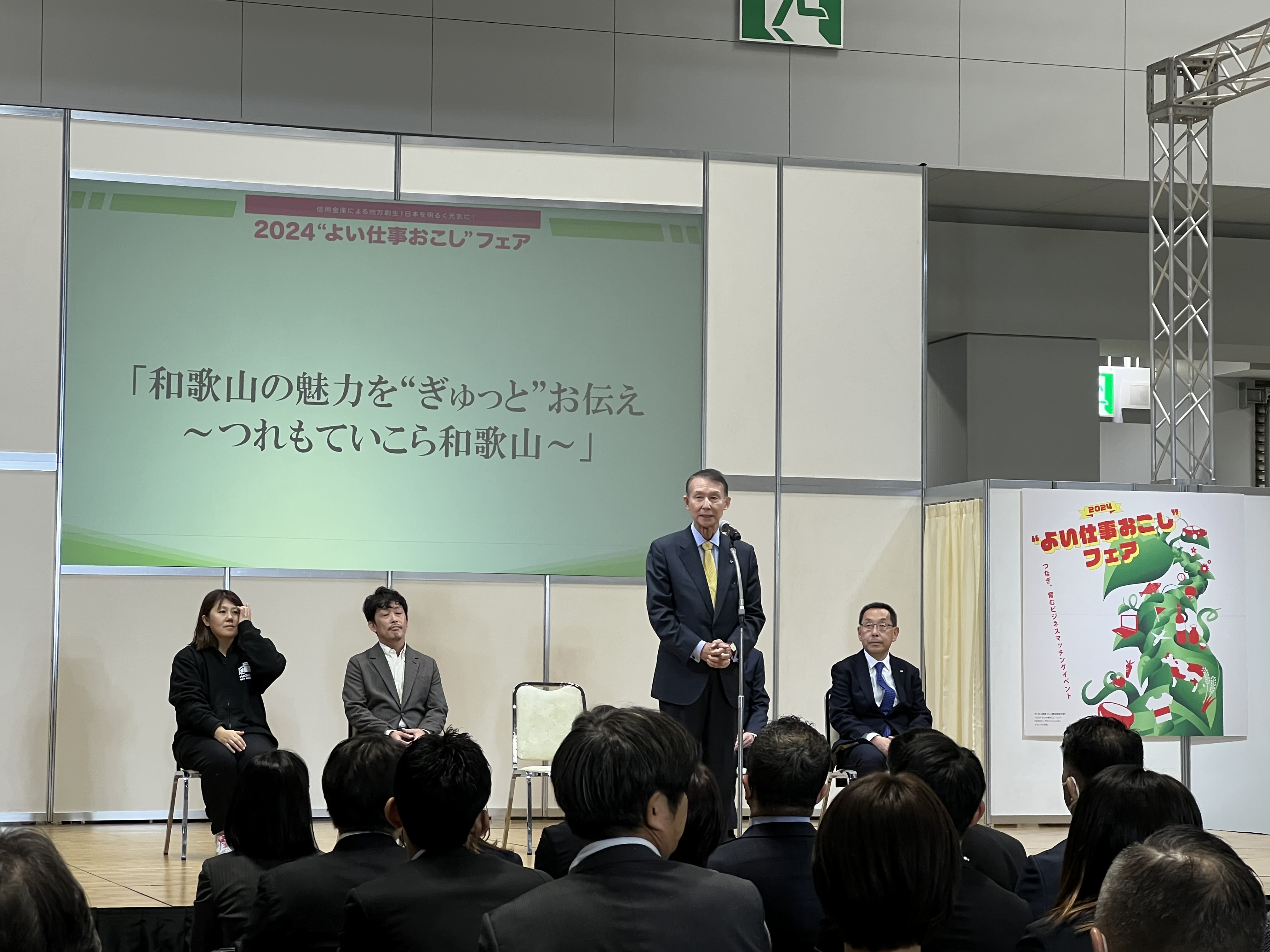 昨年末、東京ビッグサイトにて“よい仕事おこしフェア”が、12月3、4日の2日間にわたり盛大に開催されました。2日目のステージプログラムでは、約1時間和歌山県の魅力を発信する時間がとられ(「つれもていこら和歌山」)、岸本県知事からも熱のこもった県のPRがなされていました。