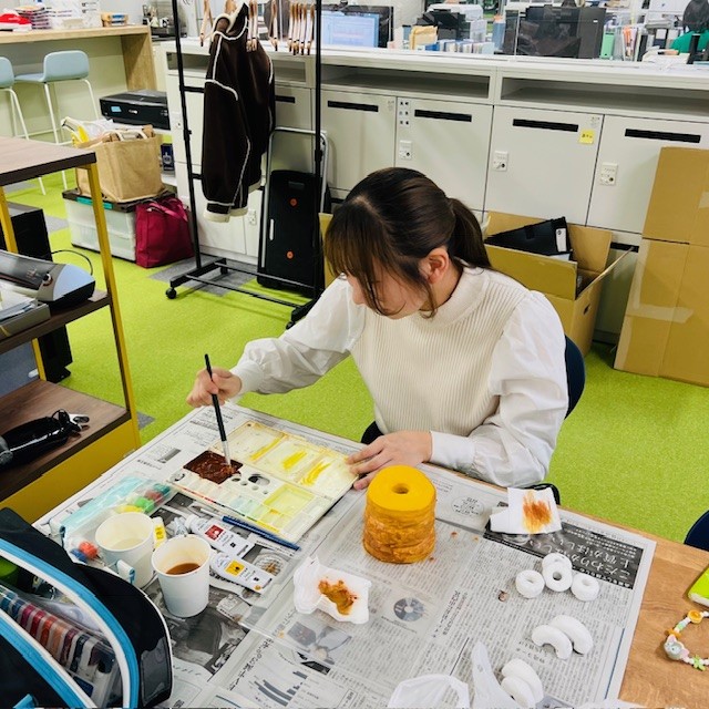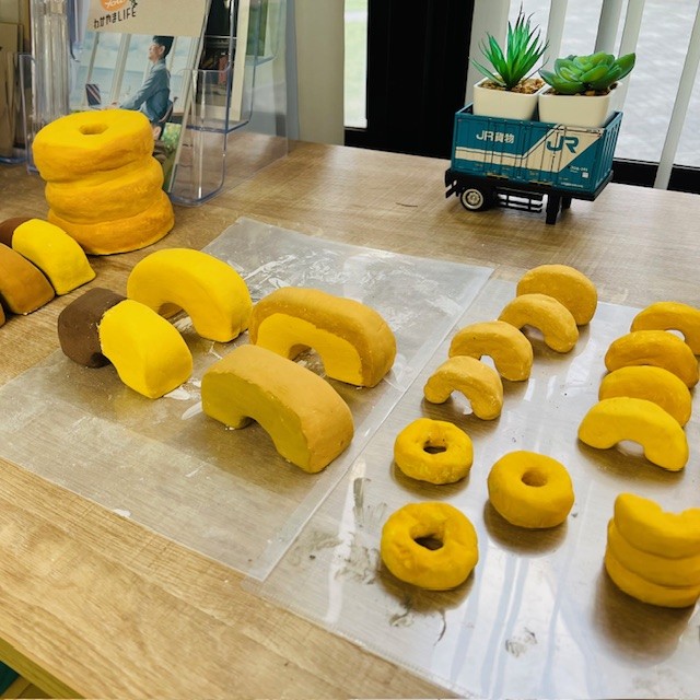 売場販促物デザイングループでは、売場での見せ方を工夫するため、粘土でバウムクーヘンのサンプルや展示物を制作するなど、来場者の目を引く演出を検討しています。