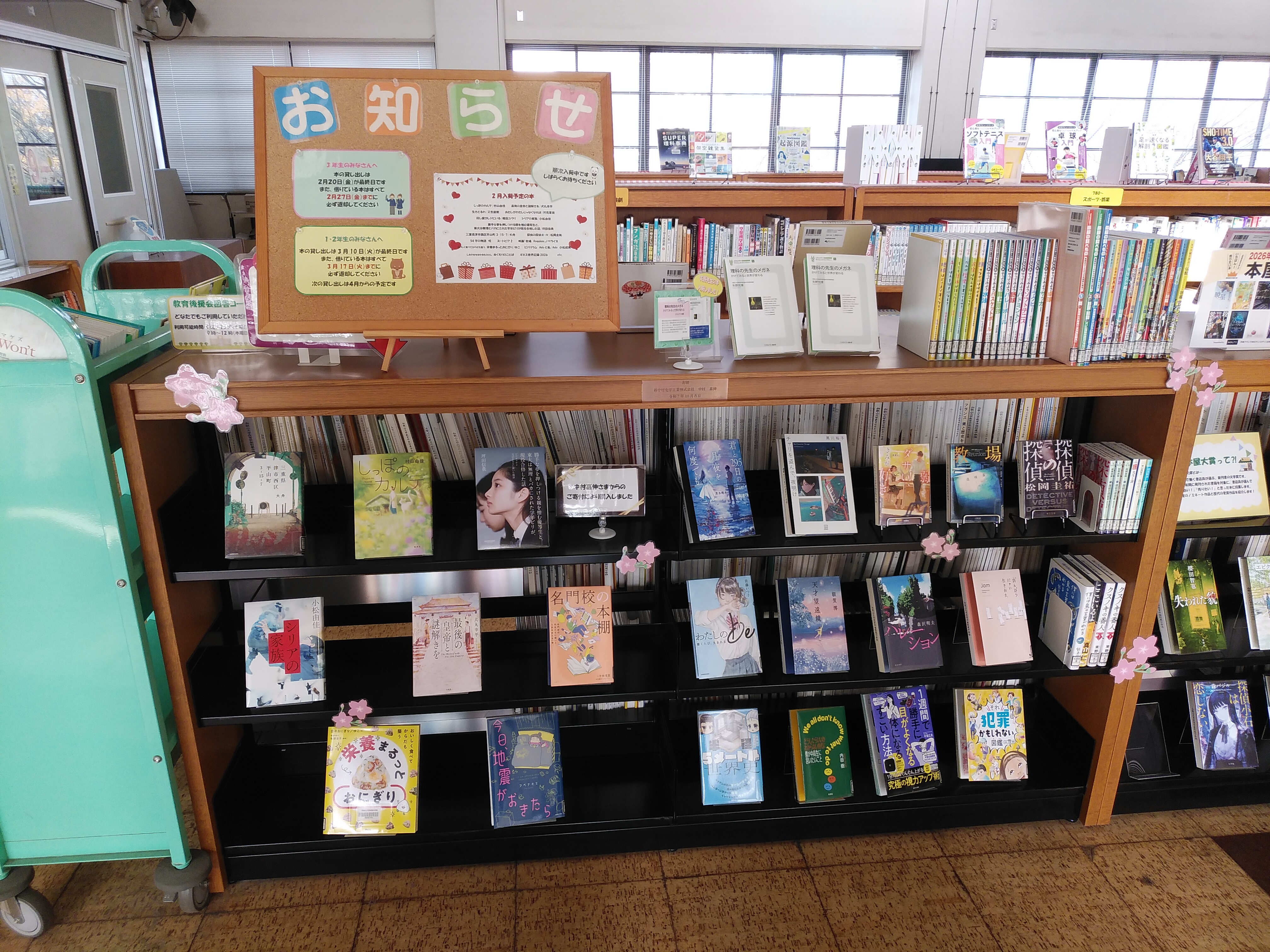 本棚には、ご寄附によって購入したものであることが生徒にわかるよう図書館担当職員が作成したボードを提示し、購入した寄贈プレートを設置いたしました。