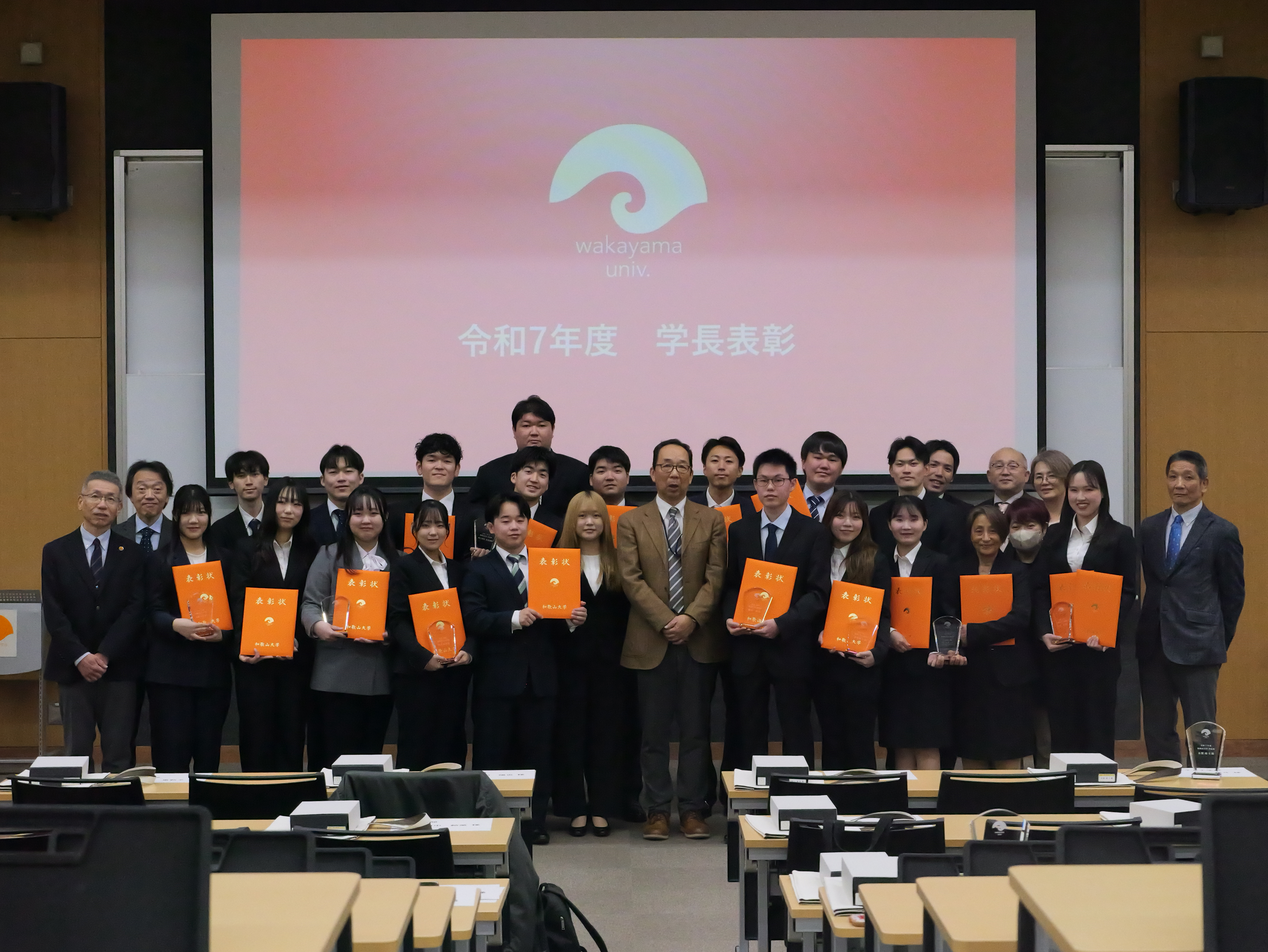 令和8年3月23日(月)に学生表彰(学長賞)授与式を挙行し、計13の個人・団体に対し、学長から表彰状及びクリスタルトロフィが授与されました。