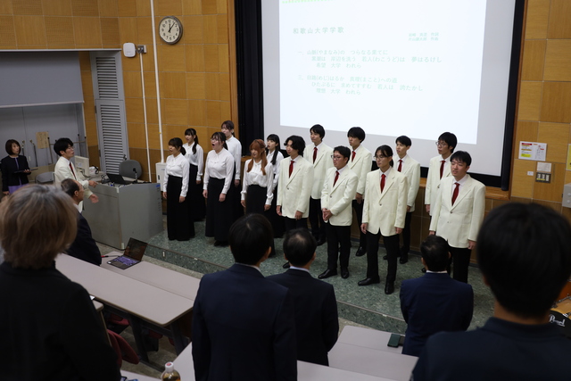 本山貢学長から、本年は教育学部とシステム工学部が節目の年になることと、「わだいフェスタ」開催の趣旨として、学生達の活躍する姿を発表する場にしたいという挨拶があり、和歌山大学混声合唱団による学歌合唱を行いました。