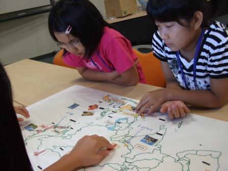 では、次に先生から渡されたのは国の特産物や有名な所が貼られたシールです。これをみんなに配って地図に貼っていきます☆ みんな分かるかな!?