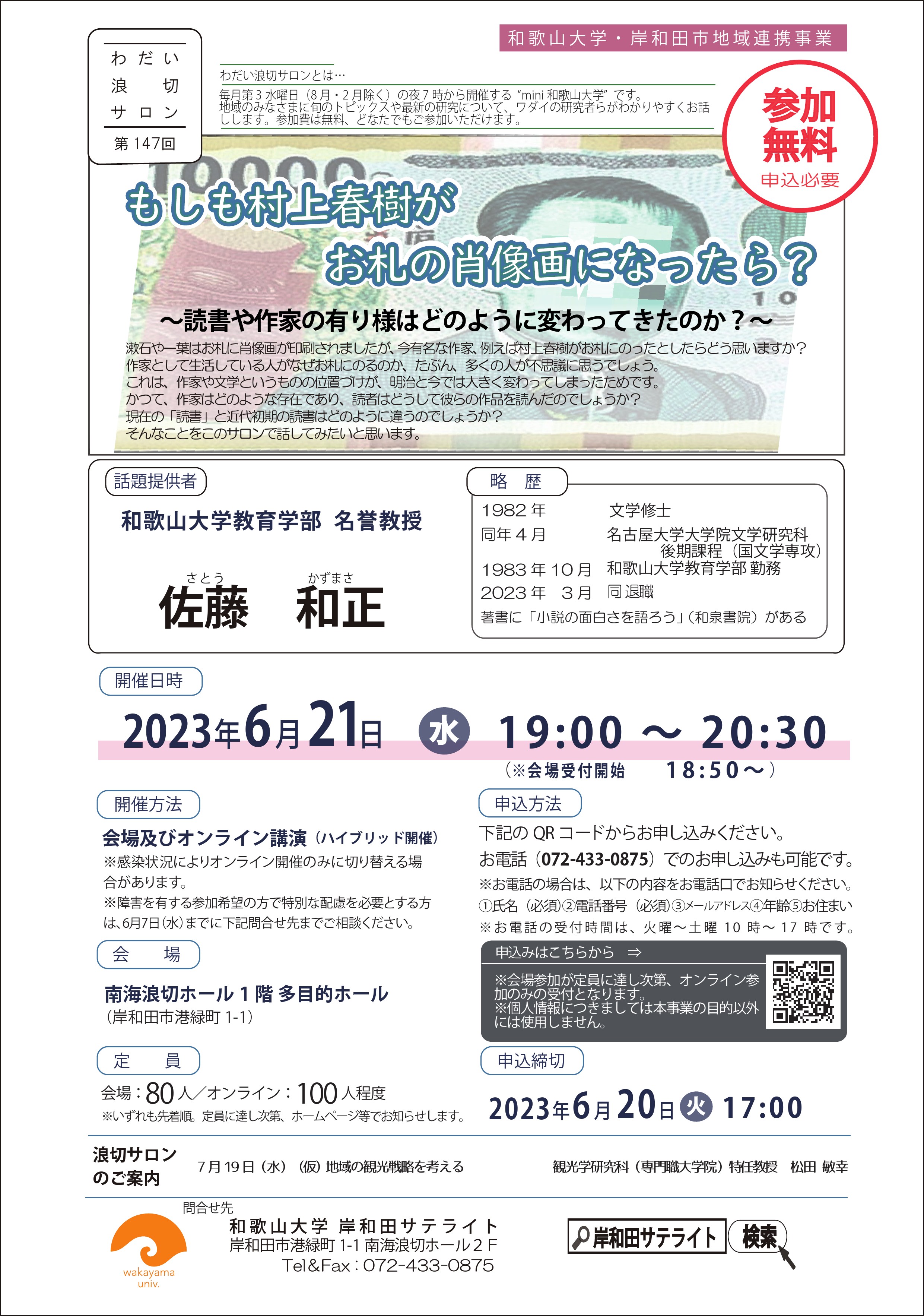 今回は、和歌山大学教育学部名誉教授の佐藤 和正(さとう かずまさ)先生をお招きし、「もしも村上春樹がお札の肖像画になったら?~読書や作家の有り様はどのように変わってきたのか?~」についてお話しいただきます。