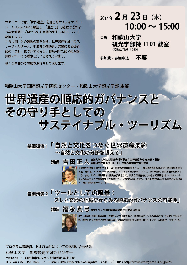 この度、和歌山大学国際観光学研究センターならびに観光学部では、筑波大学大学院人間総合科学研究科世界遺産専攻専攻長・教授、国際自然保護連合(IUCN)世界保護地域委員会委員の吉田正人氏、東京大学大学院新領域創成科学研究科准教授の福永真弓氏を基調講演講師にお迎えし、「世界遺産の順応的ガバナンスとその守り手としてのサステイナブル・ツーリズム」と題したセミナーを開催することとなりました。