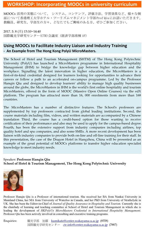 【CTR・観光学部】5/8(月)13時10分~開催!~WORKSHOP: Incorporating MOOCs in university curriculum
