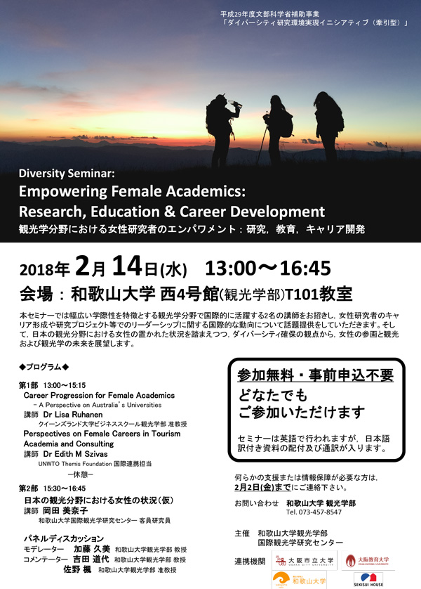【観光学部・CTR】2/14(水)13時~開催!~Diversity Seminar「観光学分野における女性研究者のエンパワメント:研究,教育,キャリア開発」