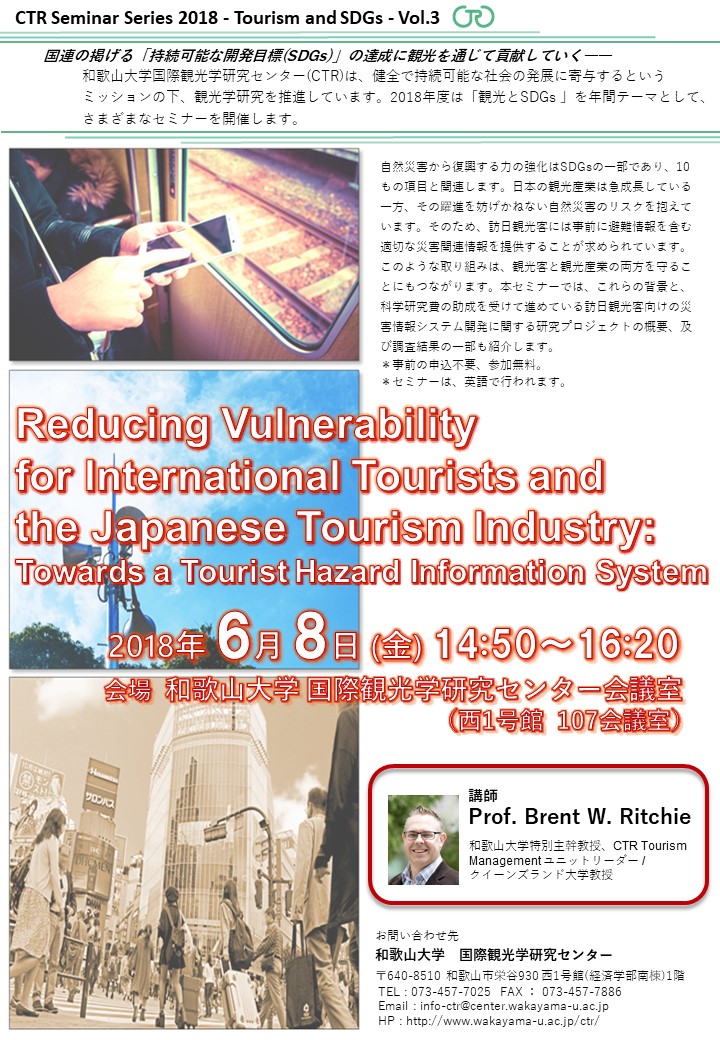 【国際観光学研究センター】6/8(金)開催!CTR Seminar Series 2018「Reducing Vulnerability for International Tourists and the Japanese Tourism Industry: Towards a Tourist Hazard Information System」