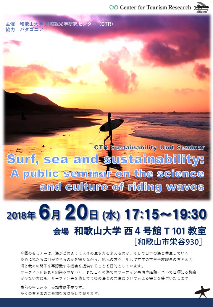 国際観光学研究センター(CTR)サステナビリティユニットでは、公開セミナー「Surf, sea and sustainability: A public seminar on the science and culture of riding waves」を開催します。