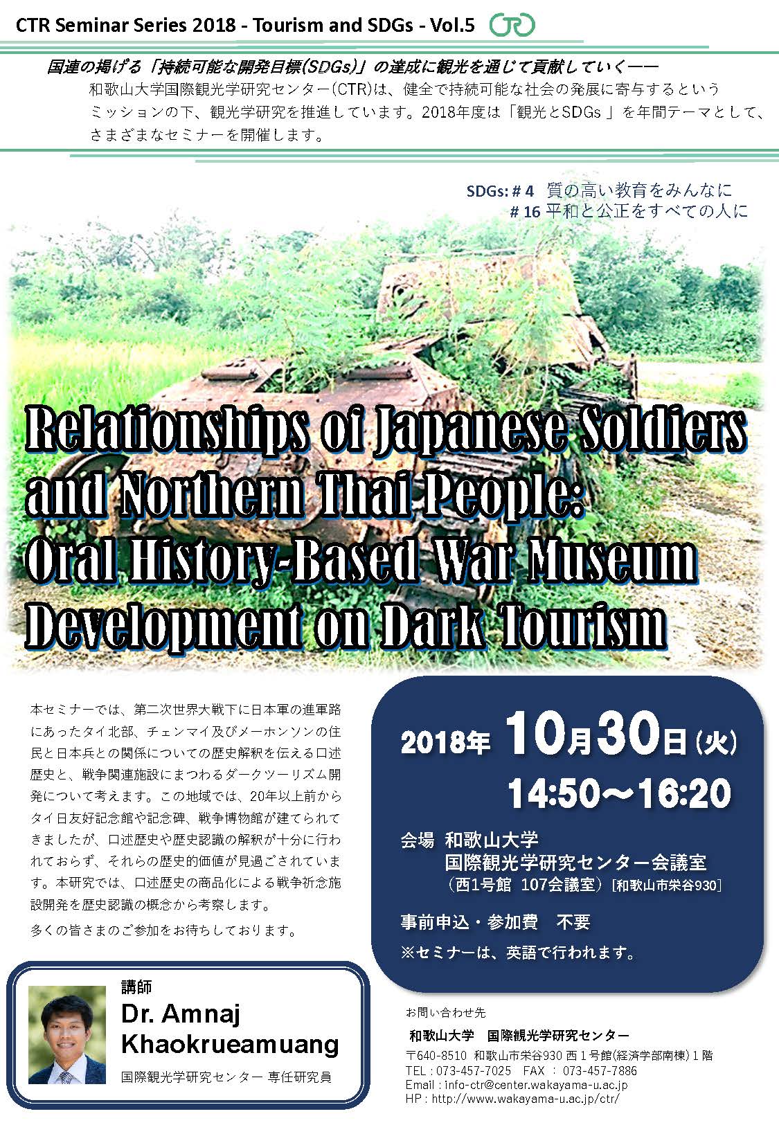 【国際観光学研究センター】10/30(火) 開催!CTR Seminar Series 2018「Relationships of Japanese Soldiers and Northern Thai People: Oral History-Based War Museum Development on Dark Tourism」