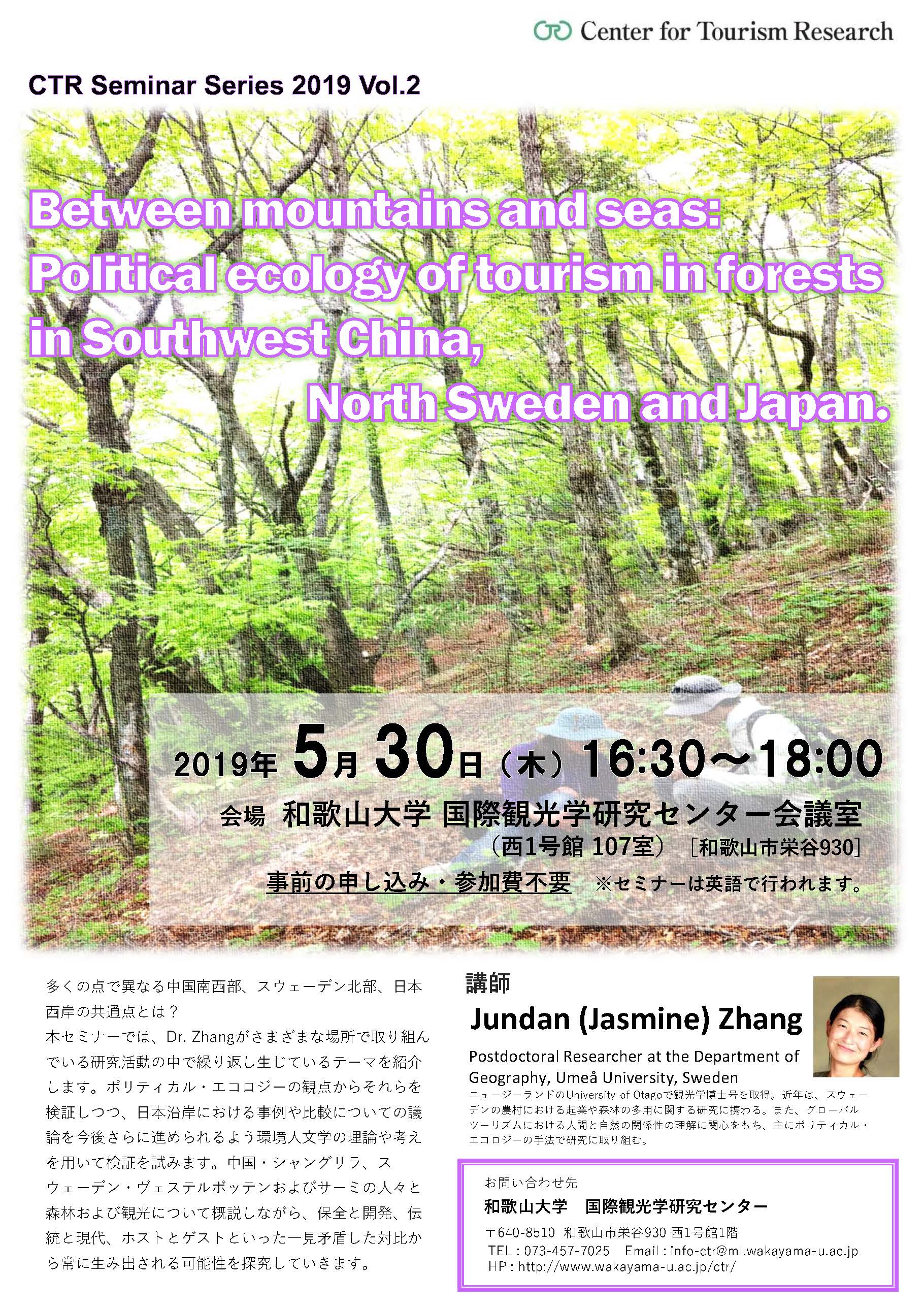 【国際観光学研究センター】5/30(木)開催!CTR Seminar Series 2019「Between mountains and seas: Political ecology of tourism in forests in Southwest China, North Sweden and Japan.」