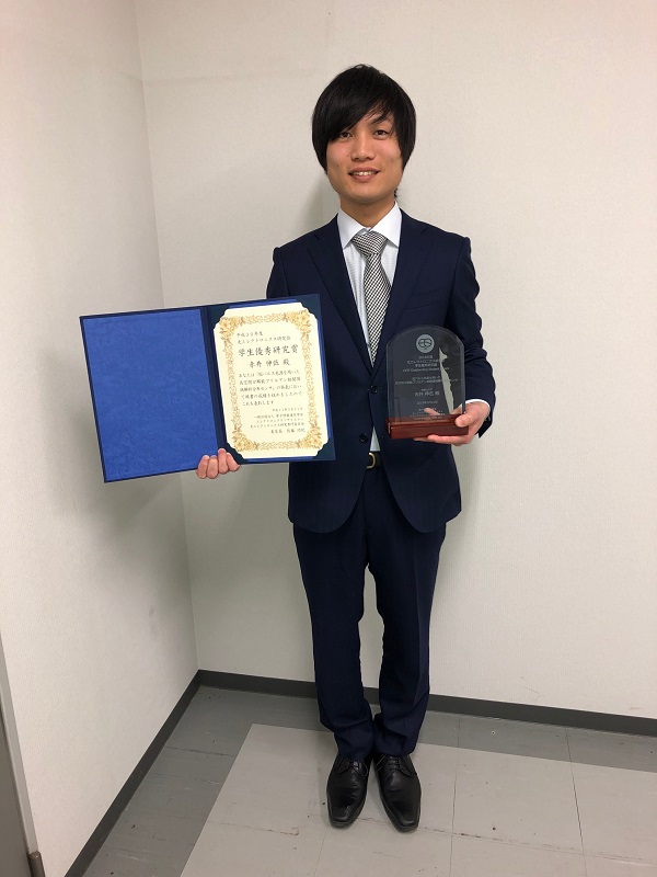 和歌山大学大学院システム工学研究科の赤井伸伍さん(物理工学クラスタ2019年3月修了、光エレクトロニクス研究室、指導教員:松本正行教授)が、電子情報通信学会 平成30年度 光エレクトロニクス研究会 学生優秀研究賞を受賞しました。