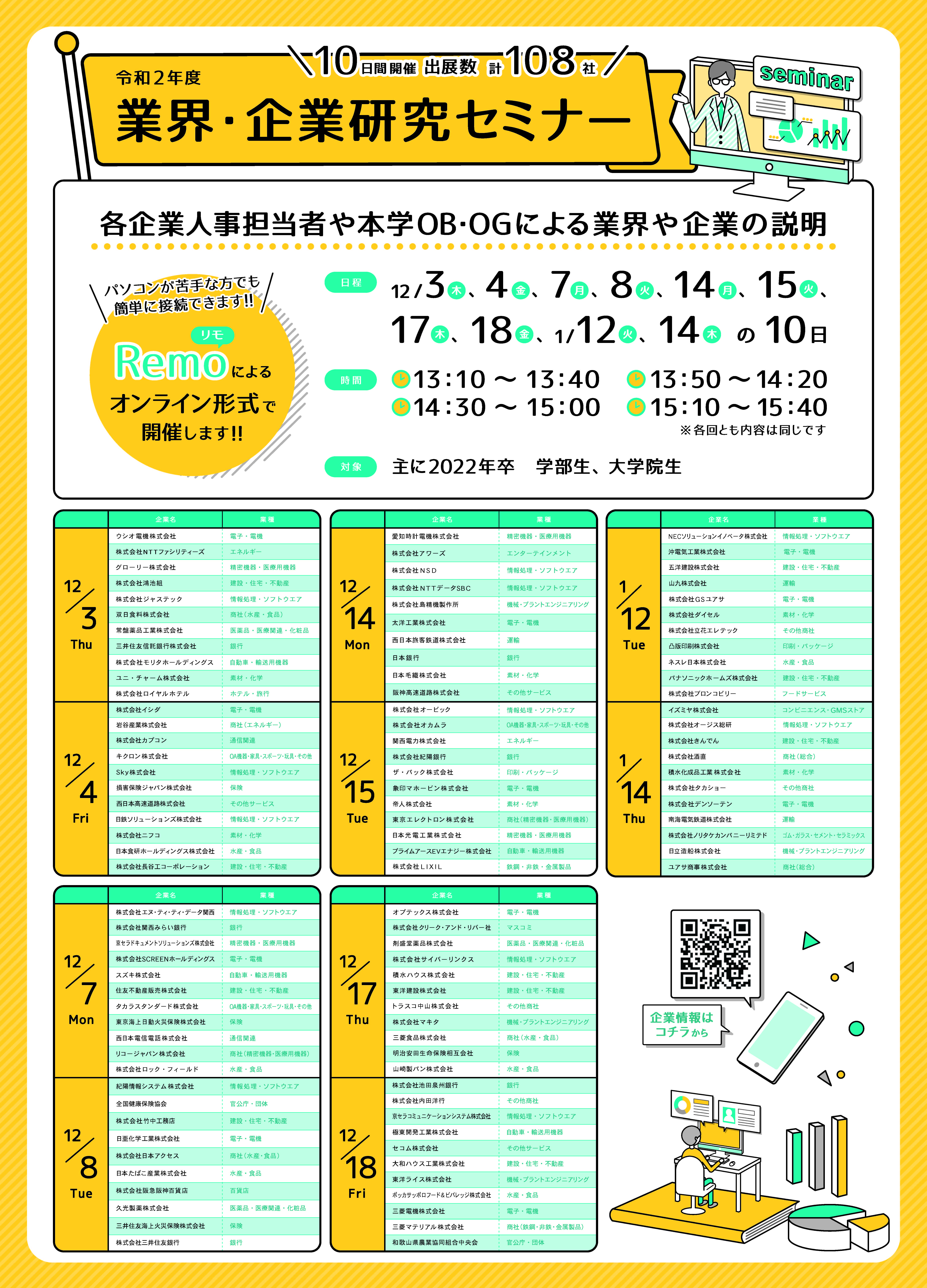 【キャリアセンター】令和2年度 業界・企業研究セミナーを開催します