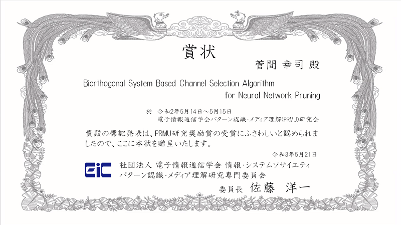 和歌山大学大学院システム工学研究科の菅間幸司さん(システム知能クラスタ2021年3月修了、和田研究室)が、電子情報通信学会パターン認識・メディア理解(PRUM)研究会 PRMU研究奨励賞を受賞しました。