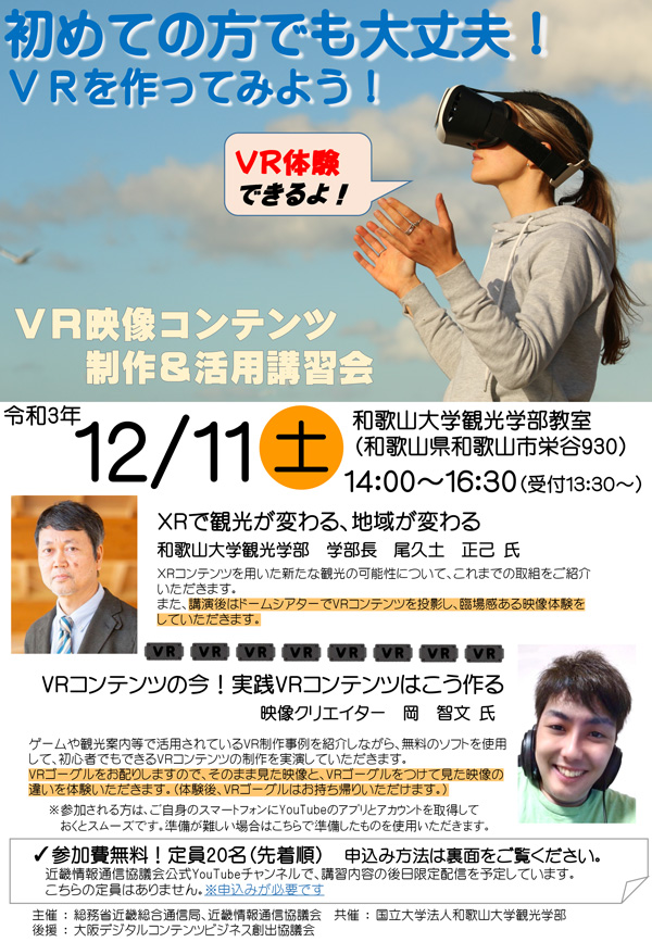 【観光学部】12/11(土)開催!~VR映像コンテンツ制作&活用講習会 in 和歌山(主催:総務省近畿総合通信局、近畿情報通信協議会/共催:和歌山大学観光学部)