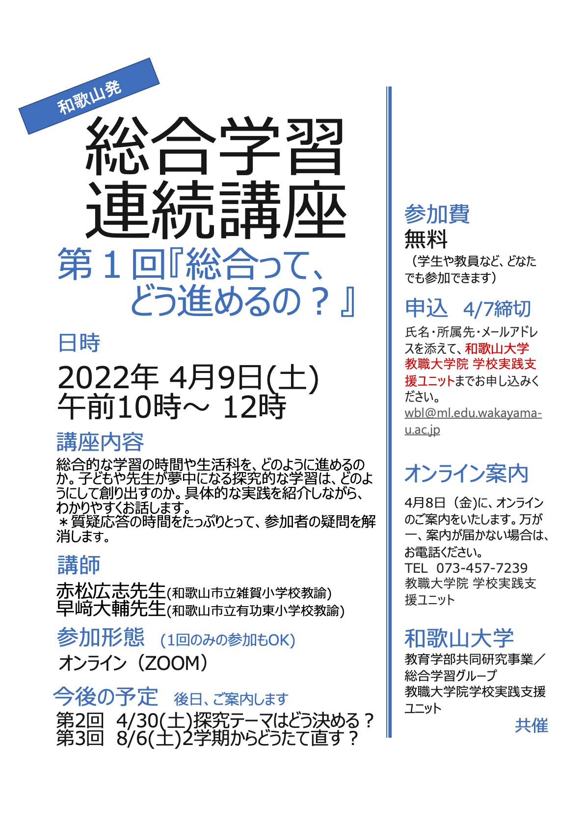 TEL 073-457-7239(和歌山大学教職大学院学校実践支援ユニット、田中)