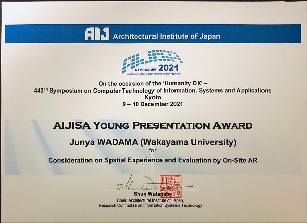 和歌山大学大学院システム工学研究科の輪玉隼也さん(博士前期課程2年、デザイン科学クラスタ、空間デザイン研究室)が、2021年12月に開催された、日本建築学会第44回情報・システム・利用・技術シンポジウム(AIJISA2021)で若手優秀発表賞を受賞しました。