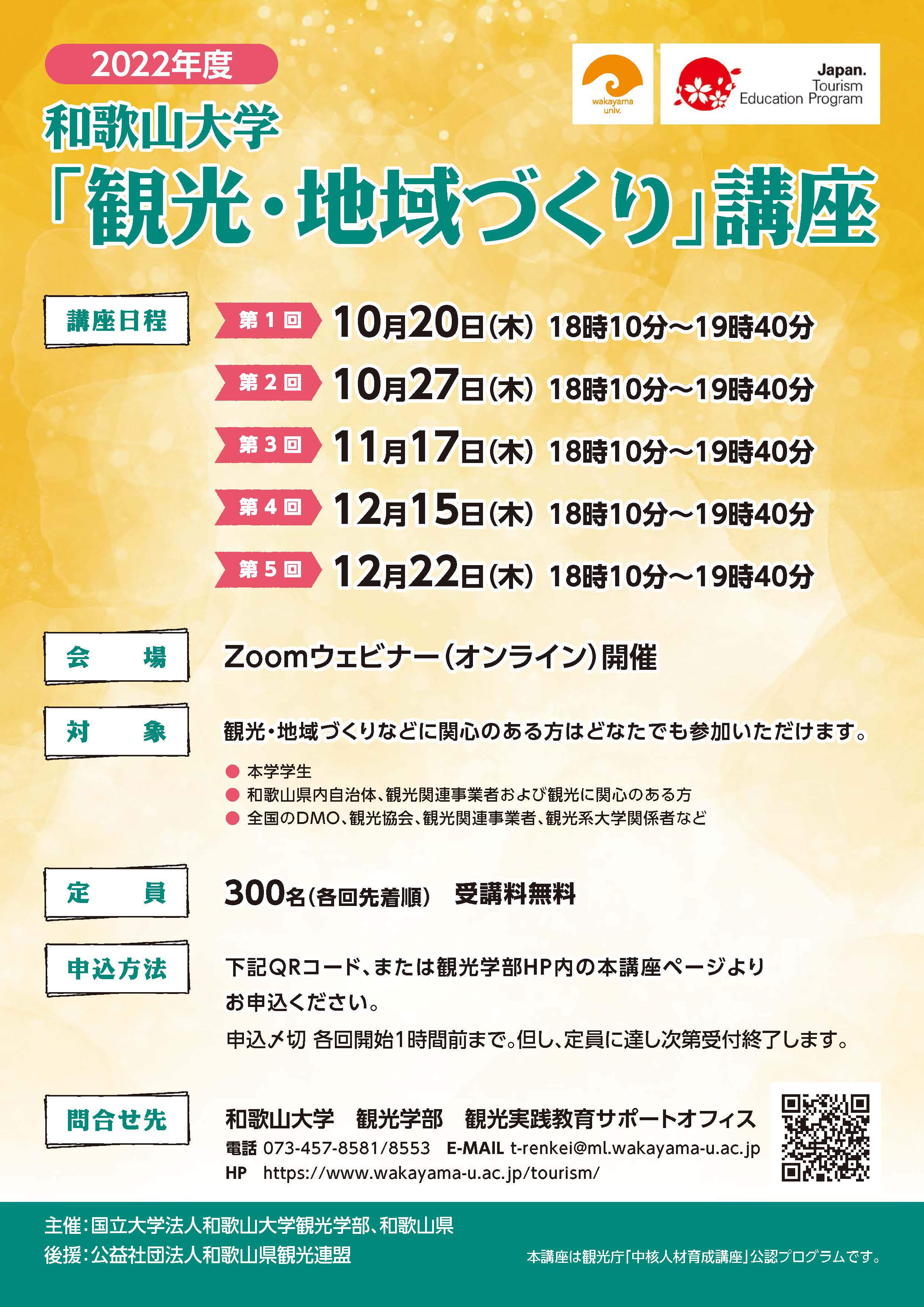 【観光学部】10/20(木)より開講!~「2022年度 和歌山大学『観光・地域づくり』講座」(オンライン公開講座)のご案内