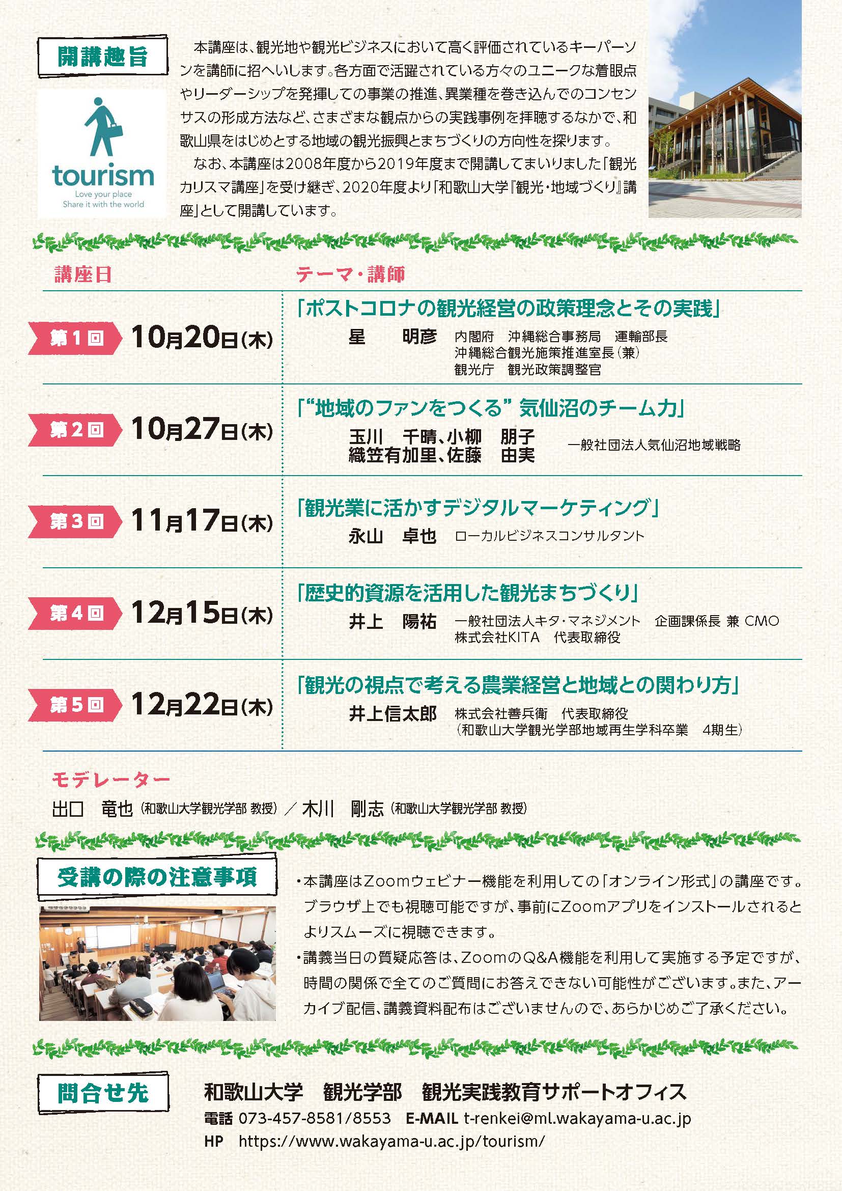 なお、本講座は2008年度から2019年度まで開講してまいりました「観光カリスマ講座」を受け継ぎ、2020年度より「和歌山大学『観光・地域づくり』講座」として開講しています。