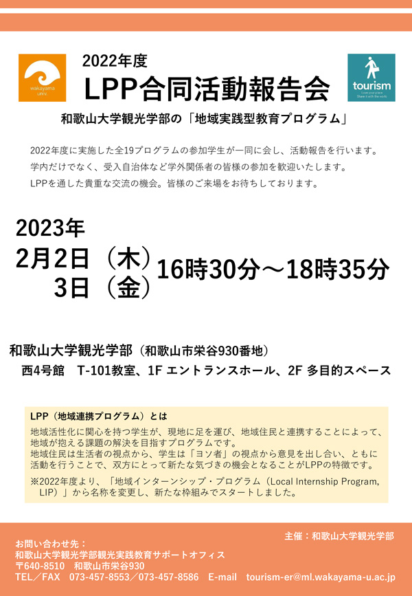 【観光学部】【関係者限定】2/2(木)・3(金)開催!~2022年度 LPP合同活動報告会:和歌山大学観光学部の「地域実践型教育プログラム」