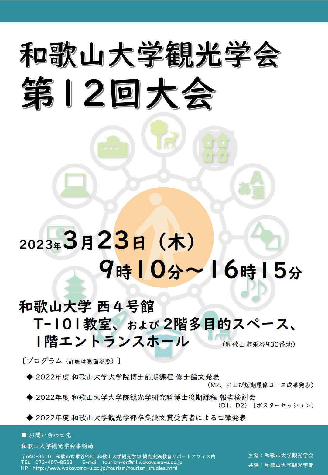 和歌山大学観光学会第12回大会は、本学大学院観光学研究科生による修士論文/博士論文報告、および2022年度観光学部卒業論文賞受賞者による発表を行います。