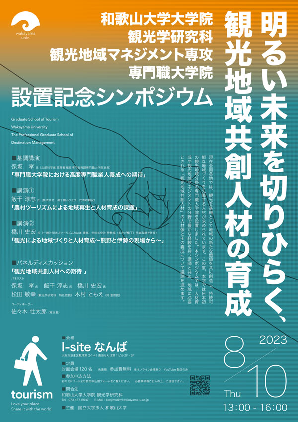 【大学院観光学研究科】8/10(木)13時~開催!~和歌山大学大学院観光学研究科 観光地域マネジメント専攻(専門職大学院)設置記念シンポジウム「明るい未来を切りひらく、観光地域共創人材の育成」