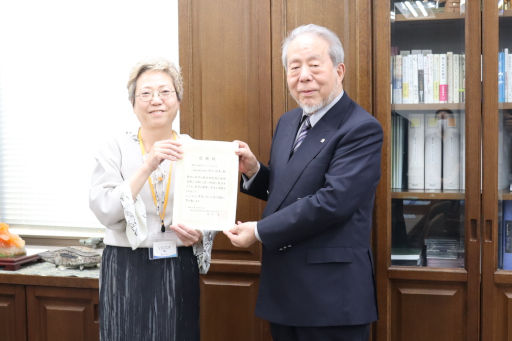10月10日(火)、株式会社サイバーリンクス(和歌山市)において、同社の村上恒夫代表取締役社長への感謝の意を表し、本学の本山貢学長から感謝状を贈呈いたしました。