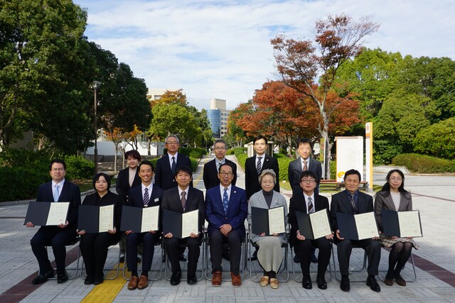 公開日 2025/11/13 令和7年度永年勤続者表彰式を行い、被表彰者13名のうち8名が出席し、本山学長から表彰状と記念品が贈呈されました。 学長からお祝いと感謝の言葉が贈られた後、和やかな雰囲気の中、記念撮影および懇親会が行われました。 本表彰は、本学に10年以上及び国立大学法人等に引き続き20年以上勤務し、かつ、勤務成績が良好な教職員に授与されるものです。