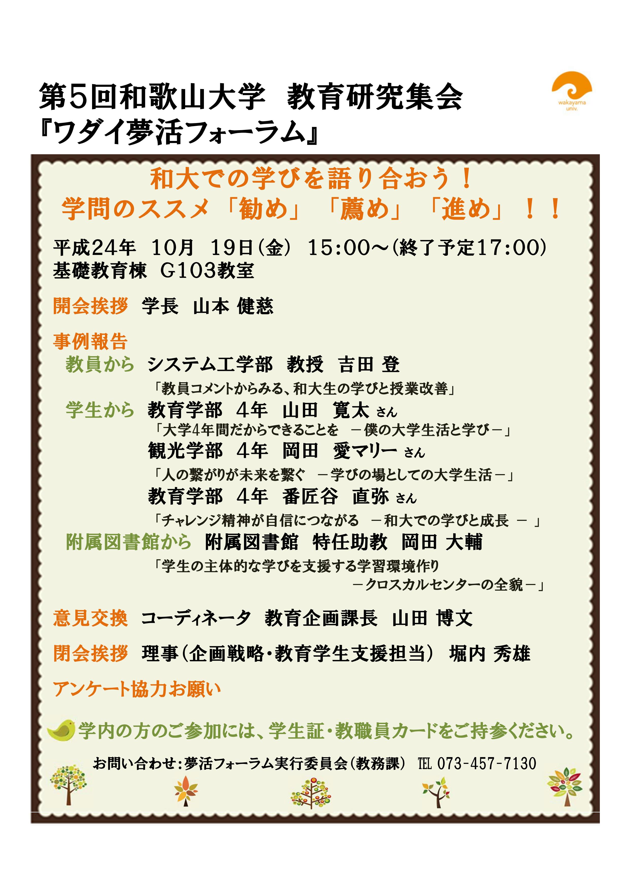 お問い合わせ : 夢活フォーラム実行委員会(教務課) TEL073-457-7130