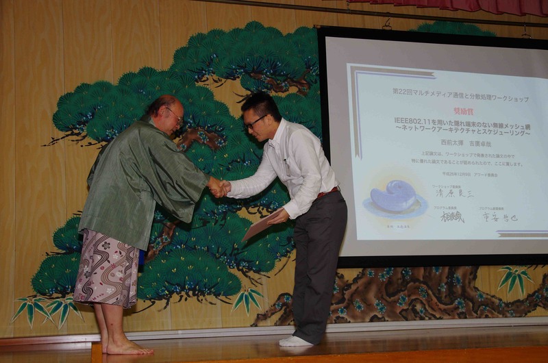 12月8〜10日に島根県松江市において開催されました第22回マルチメディア通信と分散処理ワークショップ(DPSWS2014)において発表された論文「IEEE802.11を用いた隠れ端末問題のない無線メッシュ網~ネットワークアーキテクチャとスケジューリング~」(著者:西前太揮、吉廣卓哉)に対して、奨励賞が授与されました。