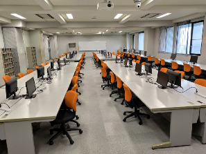 ここは、24時間使用できる演習室です。BYODパソコンの充電もでき、WI FIの環境も安定しています。課題を仕上げるために、この部屋に泊まりこむ学生もいます。