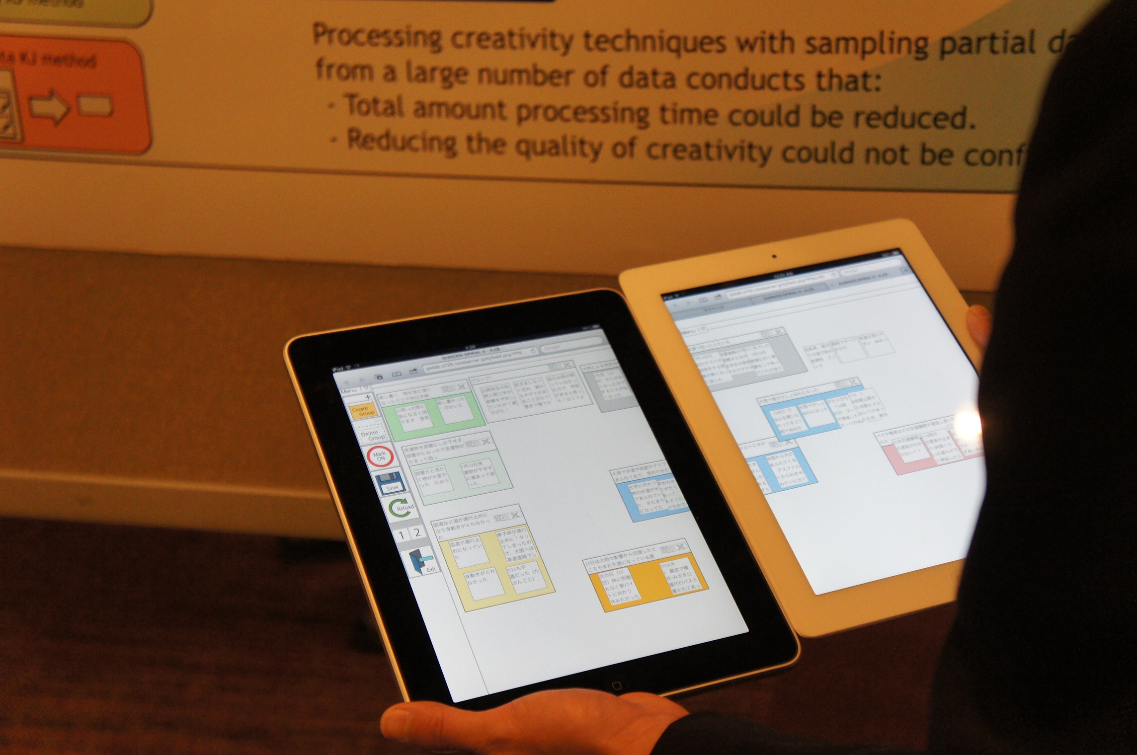 具体的には、リアルタイムWeb技術を使ったゼミ支援システムやノウハウ共有・伝達システムのほか、日本の代表的な発想法であるKJ法に基づく、防災等を主テーマとした発想支援システムなどを開発しています。また、これらのシステムを構築するためにはヒューマンインタフェース技術とコミュニケーション支援技術が必須なため、これらについて研究しています。