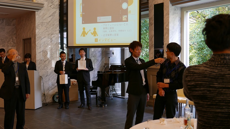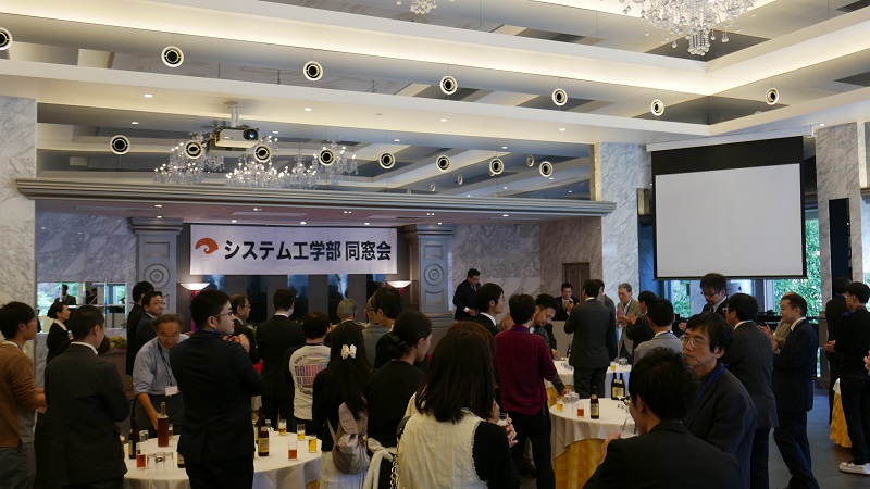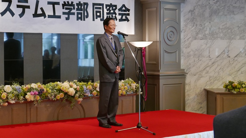 青柳会長よりご挨拶をいただくとともに、同窓会顧問でもある伊東千尋システム工学部長より、大学や学部の現状報告がありました。その後、ご退職された3名の教員の近況報告や、抽選によりインタビュー形式で近況を報告してもらう催しが行われました。