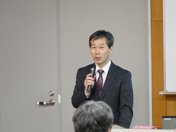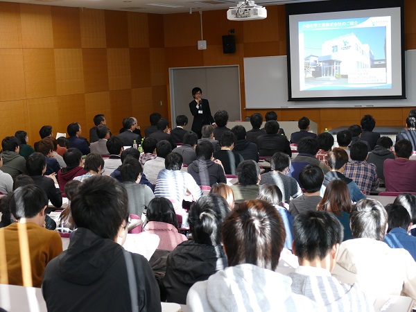 はじめに、竹田純久和歌山化学工業協会会長からご挨拶をいただきました。その中で、和歌山は、わが国で初めて工業規模での化学合成が始まった地であり、現在でも、化学工業が、和歌山の主要な産業であるという説明がありました。続いて、各企業の研究者や担当者が、それぞれの企業の概要や研究開発業務について発表しました。参加者は、発表者の詳しい説明に熱心に耳を傾けていました。なお、発表者のうち5名は、本研究科ならびに本学部の卒業生であり、いずれも研究職として第一線で活躍しています。