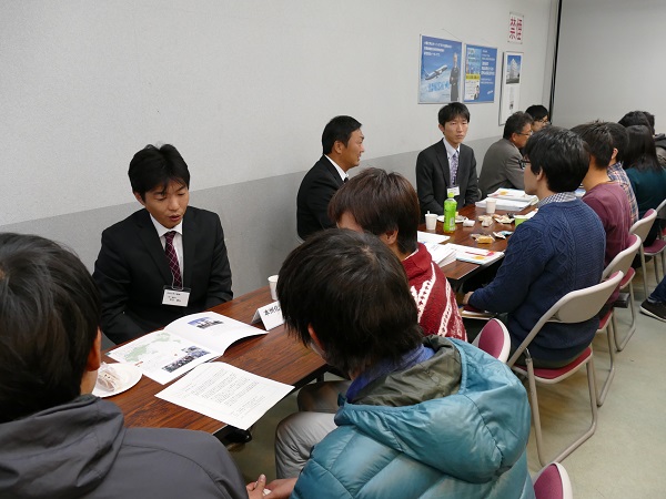 その後会場を移し、懇親会が開かれました。企業ごとにブースを設置し、その担当者と学生とが直接会談をしました。お菓子を食しながらの和やかな雰囲気の中でも、説明を聞く学生の目は真剣そのものでした。ブースには次々と学生が訪れ、盛んに質問を行う様子が見受けられるなど、とても有意義な交流会となりました。
