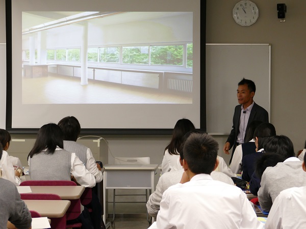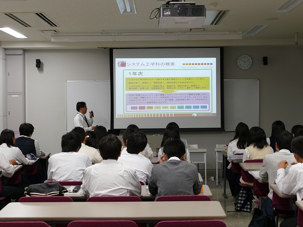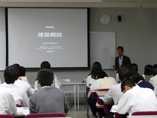はじめに、システム工学科のメジャー制など、システム工学部に関する紹介がありました。その後、環境科学メジャーの河崎昌之准教授が、「建築概説」と題した模擬講義を行いました。講義の中では、古代から中世、そして近代にわたる様建築式やその特徴が、分かりやすく説明されており、皆さん熱心に聞き入っていました。