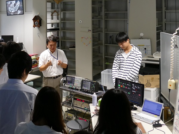 模擬講義の後は、実験室見学を行いました。電子計測メジャーの村田頼信准教授と、応用物理学メジャーの田中一郎教授または尾崎信彦准教授の実験室で、主要な研究テーマの紹介や簡単なデモ、実験装置の説明などが行われました。