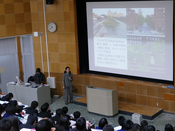 その後、「ランドスケープの創造・再生 ~地球環境問題の提起、時代の要望への回答として~」というテーマで、宮川准教授が模擬講義を行いました。講義では、自然環境を再生・修復する方法として、新たな自然環境を作り出す「環境創造」と、かつての自然環境を取り戻す「環境再生」を取り上げ、そのうち「環境創造」について、実例を交えた詳しい説明がありました。ビルの屋上や廃線の高架橋、廃棄物処理場跡地などが、現在は公園として人々の憩いの場となっている実例の紹介がありました。そして、ただ単に木や草を一度植えれば良いというものではなく、継続的に人が手を加え管理していくことも大切であるとの説明がありました。