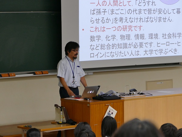 「大学で学ぶこと」と題した講義では、勉強は、目先のテストのためではなく自分自身の能力を高めるために行うものだと説明がありました。また、世の中には、誤った情報が氾濫しているということを、先生の専門分野である、画像解析技術を例にとって説明され、誤った情報に翻弄されないために、大学で学ぶことを通じて本質を見抜く力をつけてほしいと訴えていました。