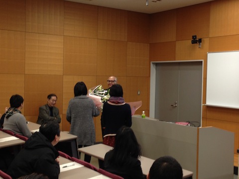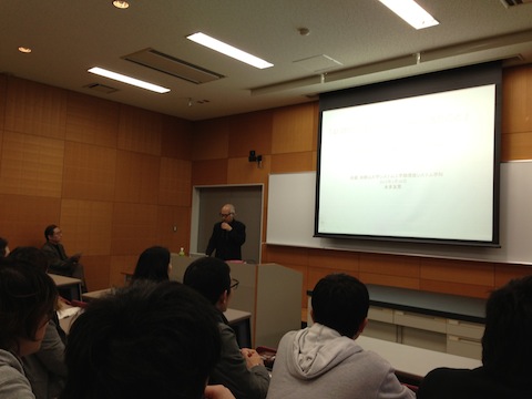 本年度末をもって定年退職されます、本学科建築設計研究室の本多友常教授の最終講義が平成25年2月16日(土)に行われました。 当日は100名を超える卒業生、在校生、大学関係者、また先生のお仕事でご縁のあった方々にお集まりいただき、先生の学生時代のコンペのお話に始まり、和歌山大学に赴任した後の本学観光学部棟の設計、高野口小学校の改修などのお話をご講演いただきました。