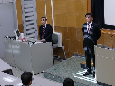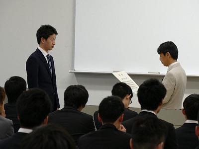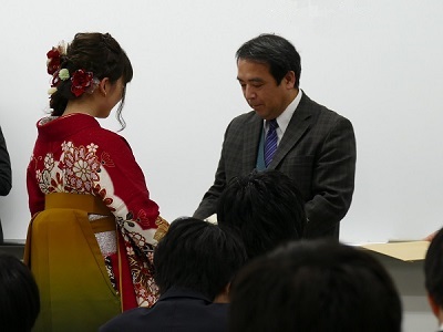 学位記・修了証書授与式終了後の午後1時からは、システム工学部A棟101室にて、成績優秀者表彰式を行いました。これは、各学科で成績が最も優秀であった学生を表彰するもので、伊東千尋学部長より、記念品が手渡されました。