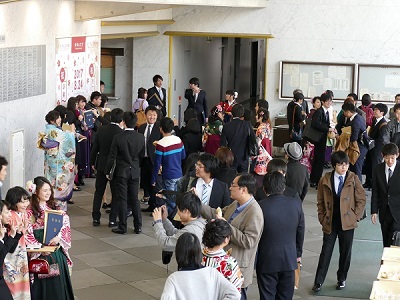 また、システム工学部A棟1階玄関ホールでは、同窓会主催の祝賀会が開催されました。たくさんの卒業生・修了生が集まり、教員や友人と談笑したり、記念撮影をする姿があちこちで見受けられました。