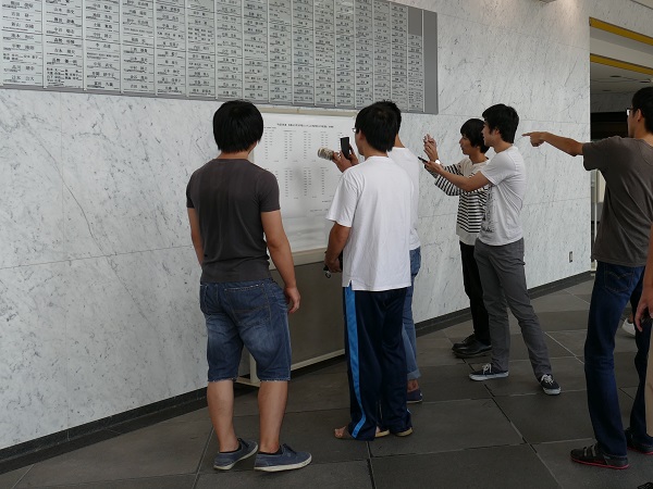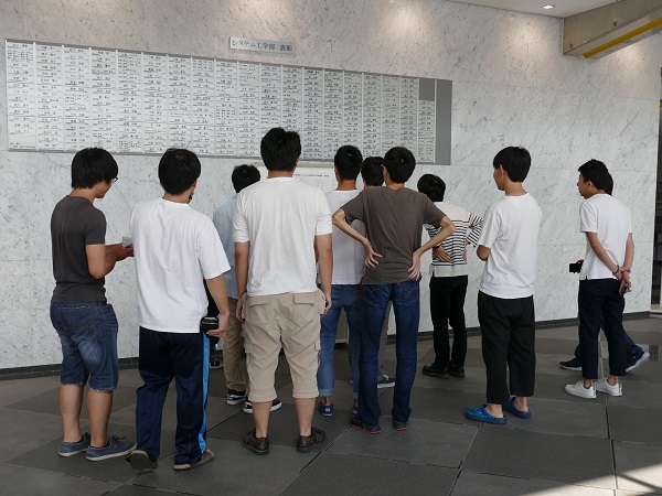 午前10時、システム工学部A棟1階のエントランスホールに、博士前期課程および博士後期課程の試験合格者の受験番号が掲示されました。さっそく掲示の前に集まり、番号を確認したり、写真を撮ったりする受験者の姿が見られました。