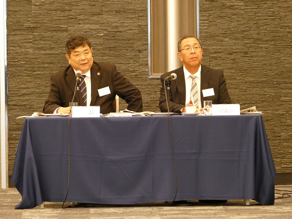 【左】挨拶を行う瀧寛和学長 【右】議長の宗森純システム工学部長(左)と副議長の野々村修一岐阜大学工学部長