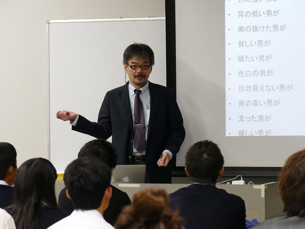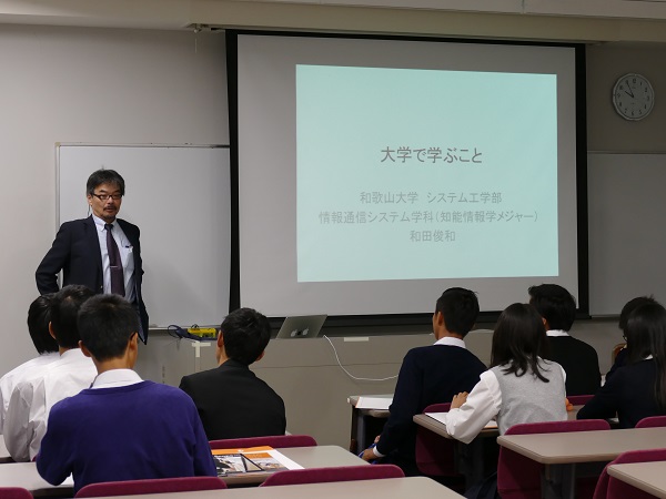 はじめに、学生広報チーム「PRism」のメンバーから、システム工学部を含む大学全体の概要説明がありました。その後、知能情報学メジャーの和田俊和教授が模擬講義を行いました。「大学で学ぶこと」と題した講義では、まず、勉強は、目先のテストや周囲の人のためではなく、自分自身の価値を高め社会で活躍するために行うものだという内容で始まりました。また、世の中には、誤った情報や意図的に操作した情報が多いということが、和田教授の専門であるコンピュータビジョンの分野を例として示されました。最後に、物事を論理立てて考え、その本質をとらえることが重要だという話がありました。