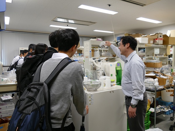 その後の研究室見学では、2つの班に分かれ、機械電子制御メジャーの土橋宏規講師と環境科学メジャーの谷口正伸助教の研究室を交互に見学しました。土橋講師の研究室では、産業応用を目指したロボットハンドに関する研究の紹介や、高校生自身によるロボットアームでの把持の実演などが行われました。また、谷口助教の研究室では、研究テーマの紹介や、水質調査などに用いる化学分析装置の説明などが行われました。普段目にすることのないような装置を前に、皆さん説明に熱心に聞き入っていました。
