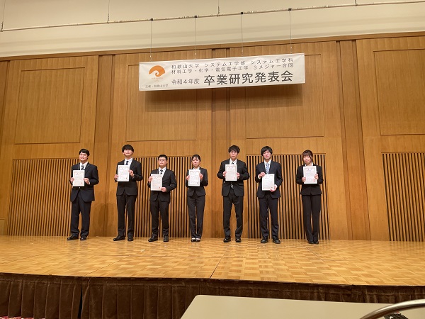 発表者は、ショートプレゼンテーションで、各自の研究の概要を説明した後、ポスター発表を行いました。各メジャーの学生に加え、和歌山工業高等専門学校専攻科2年生の3名が特別発表を行い、ポスター発表を行いました。それぞれの発表について教員が評価を行い、各メジャー主任より優秀発表者に表彰状が授与されました。