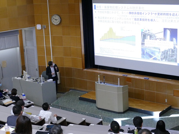 本発表会は、本学大学院の野村孝徳システム工学研究科長の開会挨拶で幕が開き、続いて口頭発表が行われました。第1部は本研究科の教員が発表を行い、第2部は大阪公立大学大学院工学研究科の教員が発表を行いました。企業や公的機関の関係者など約50名が参加し、研究者の発表に熱心に耳を傾けていました。