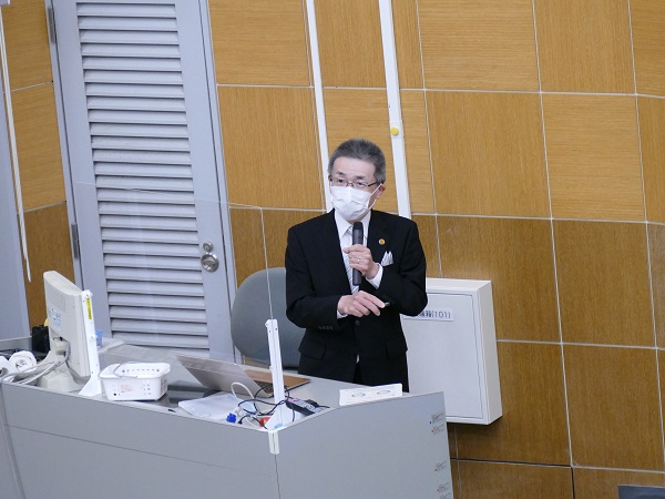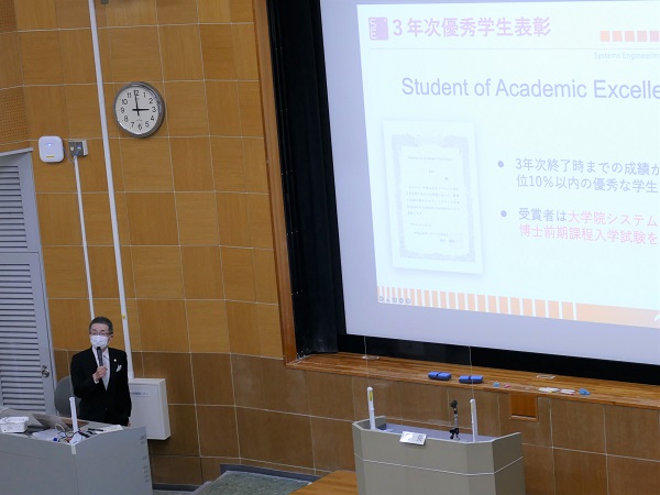 後援会総会後に、北1号館101室では、後援会システム工学部支部総会が行われ、最後に、野村孝徳学部長が、システム工学部の概要および特長、優秀な学生に対する学部独自の表彰制度、進路・就職状況、学部独自の取り組みなどについて説明しました。