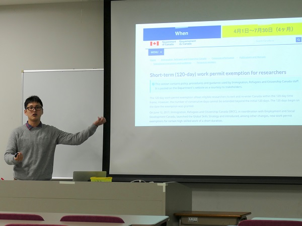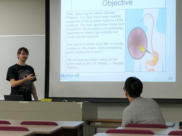 Julienさんは2019年の1月から4月までの4ヶ月間、柏さんは2019年4月から7月までの4ヶ月間、それぞれのインターンシップ先に留学しました。今回の報告会では、留学に必要な手続きや行った研究の内容、現地での生活などについて詳しい説明がありました。また、参加者からは、所属先の研究室の決め方などについての質問がありました。