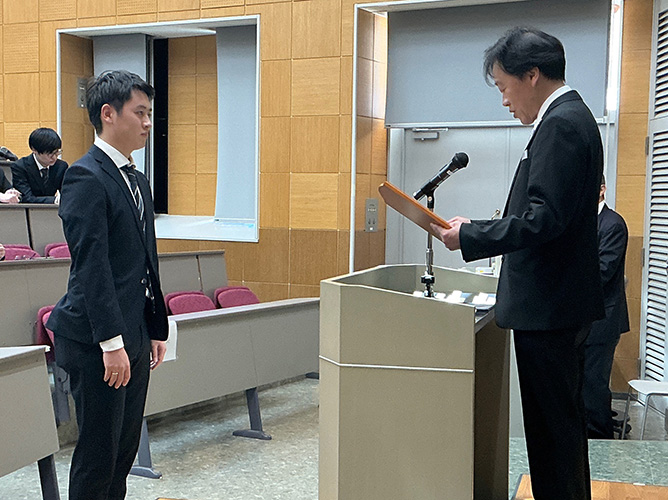 2025年3月22日にシステム工学部学位記授与式(卒業式)が行われ、在学4年間を通じて良好な成績を収めた成績優秀学生表彰には、ESメジャーから嶋吉輝さん、EDメジャーから中村悠暉さんの2名が表彰を受けました。お二人には記念の表彰盾が学部から贈られました。